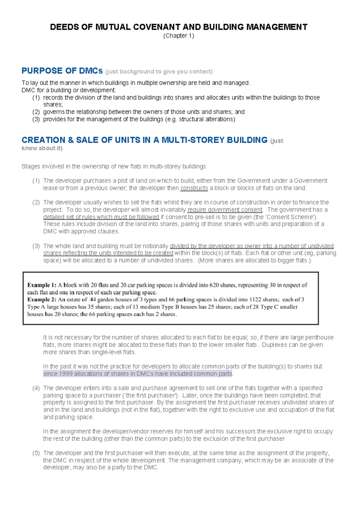 Lecture Notes for DMC DEEDS OF MUTUAL COVENANT AND BUILDING MANAGEMENT (Chapter 1) PURPOSE OF
